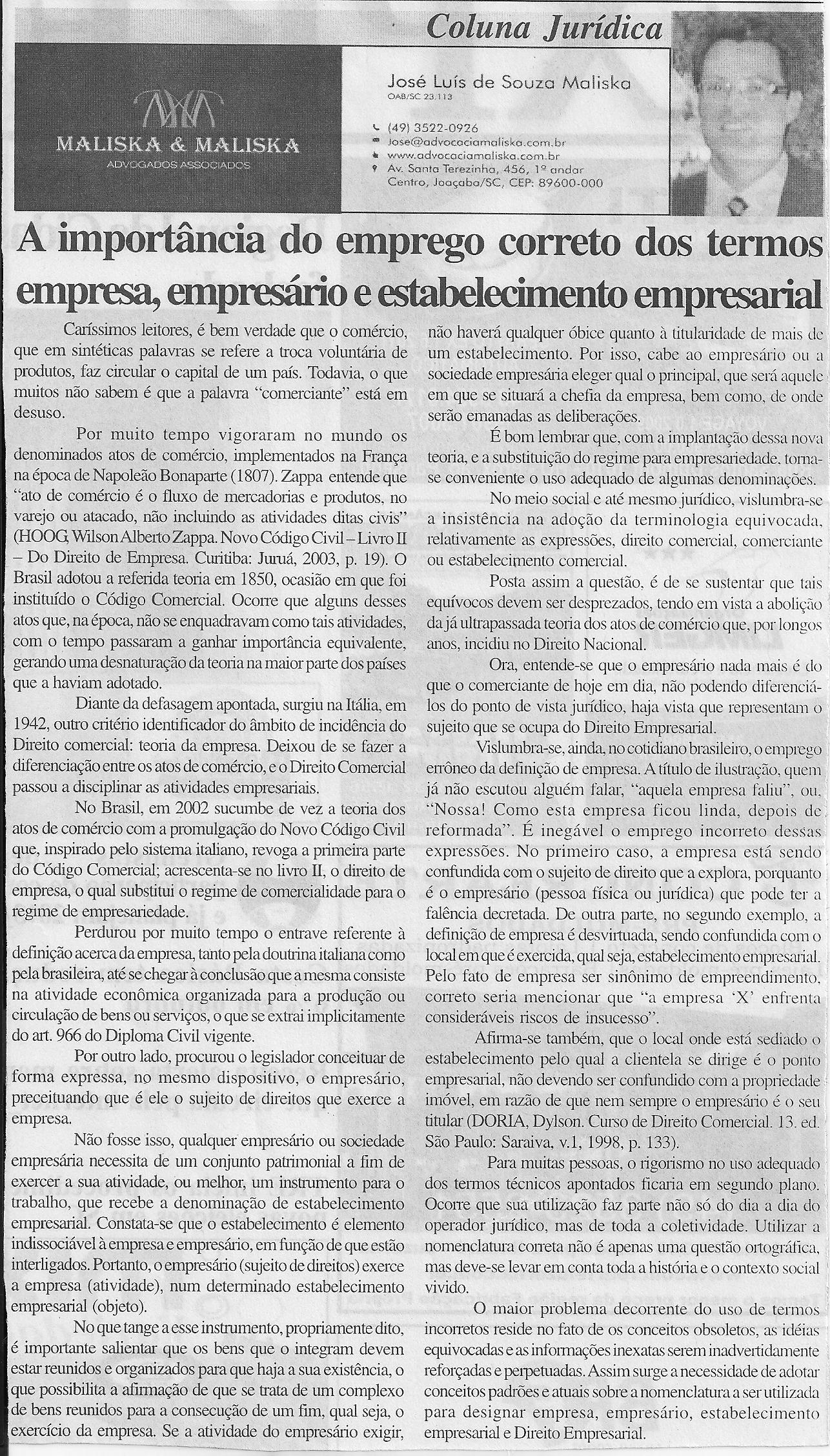 ARTIGO: A IMPORTÂNCIA DO EMPREGO CORRETO DOS TERMOS EMPRESA, EMPRESÁRIO E ESTABELECIMENTO EMPRESARIAL (FONTE: MALISKA, José Luís de Souza, publicado em 16/11/2012, in Jornal Expresso)